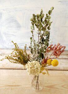 この春入荷した人気のミモザとカスミソウも一緒にお届けします。おしゃれなインテリアの一つとしてお手頃に楽しめます。生花にはないお色をお楽しみいただけます。